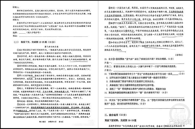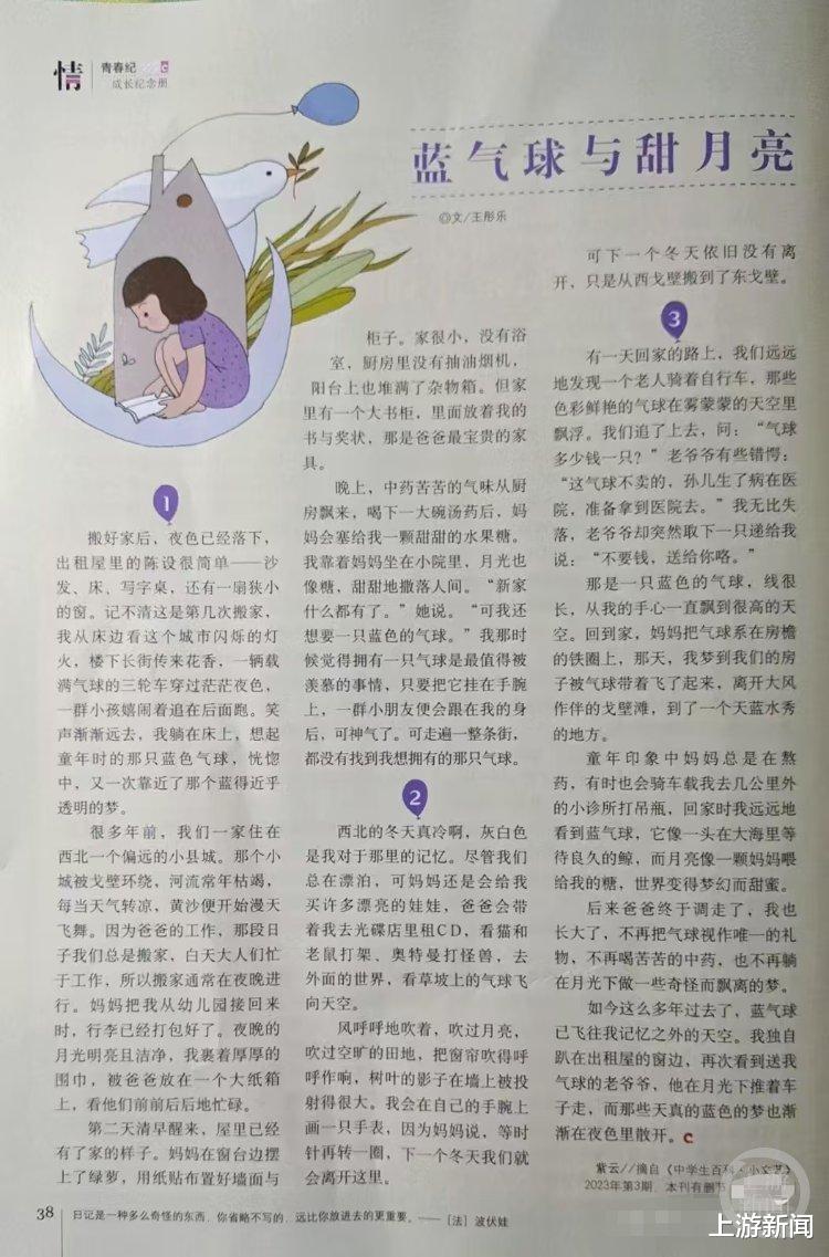 “在社交媒体上,有上海的考生在我的评论区里跟我说,我这篇文章被用为他们这学期区统考的考题了,我才知道。”6月30日,王彤乐告诉上游新闻记者,《蓝气球和甜月亮》这篇文章是自己在2022年写的,2023年发表在《中学生百科》上,后来被《青年文摘》杂志转载。“这篇文章是对我童年时期一段戈壁生活的真实记录,所以写作的过程中并没有考虑太多,都是凭感情去写的。”